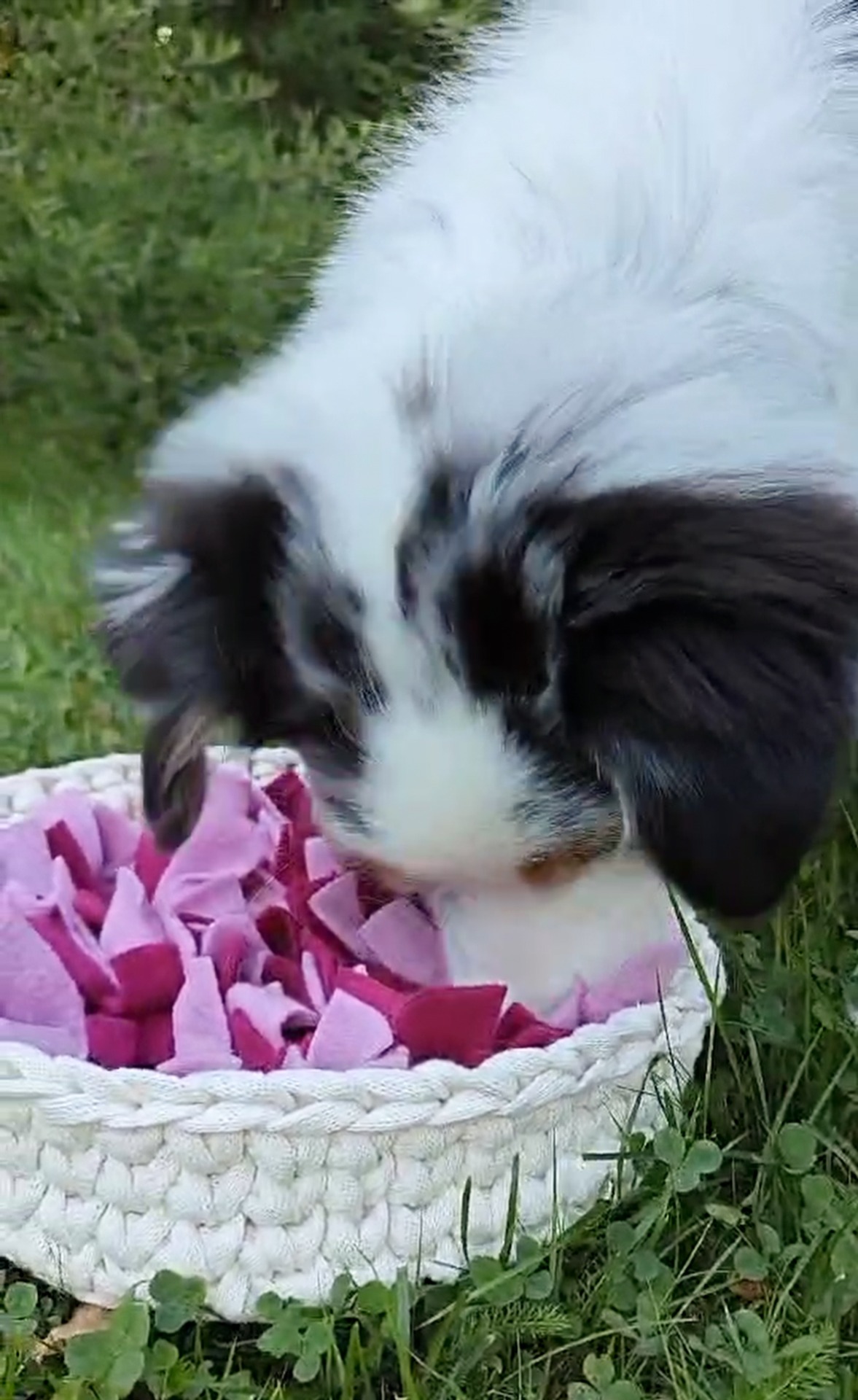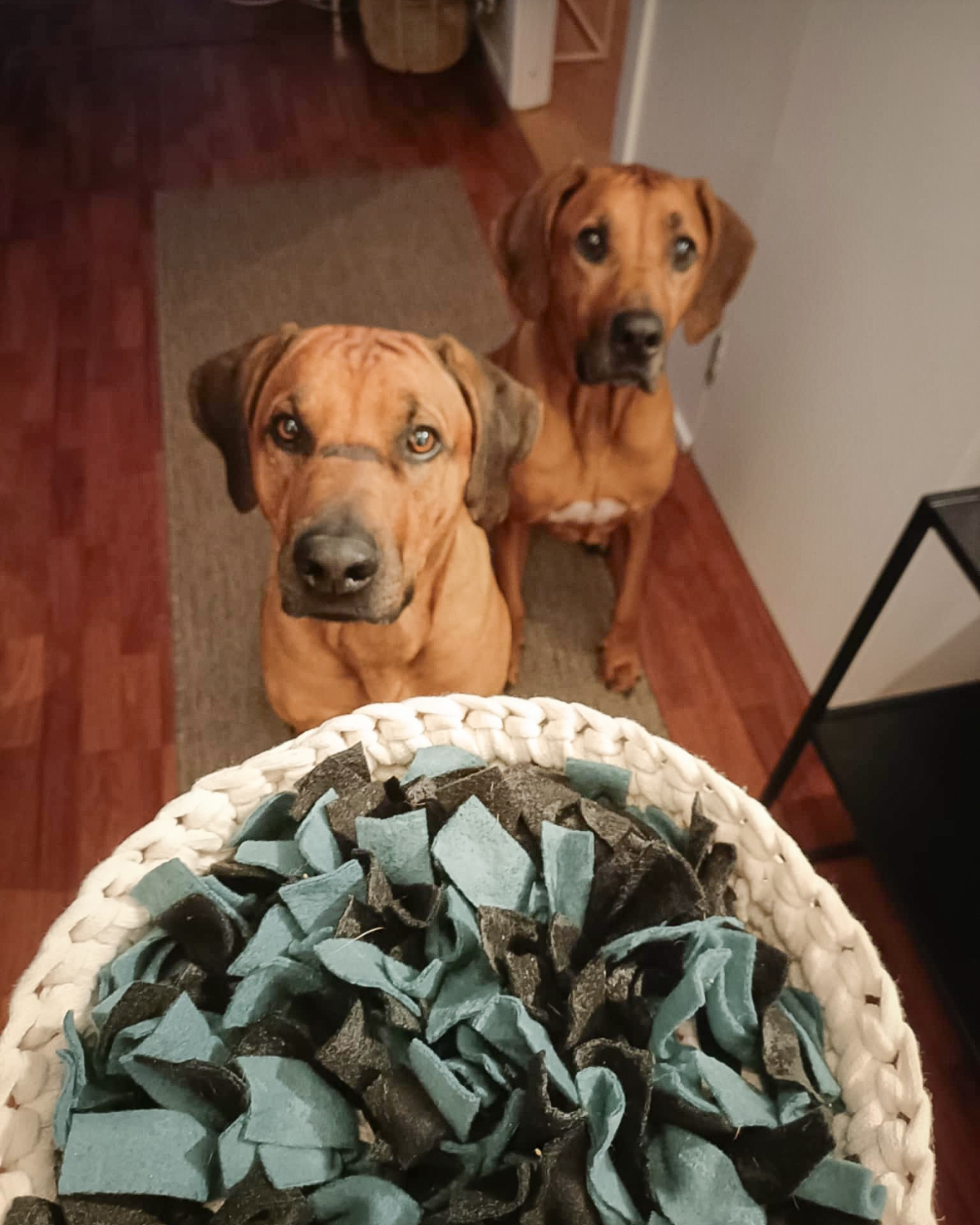 Nuuskukoriin on helppo ja nopea piilottaa nappulat/namit. Sen kuin vain ripottelee, vähän heiluttelee ja pöyhii huopasuikaleita. Perinteinen matto on jotenkin hankalampi minusta. Kori on ollut ahkerassa käytössä ja silti säilynyt hyvänä. Aussiepennulle annan lähes päivittäin osan ruuasta koriin. Kerran unohdin nostaa korin ylös niin oli ilman valvontaa saanut (vain) yhden huopasuikaleen irti. Ei oikeastaan mitään huonoa sanottavaa ole 😄