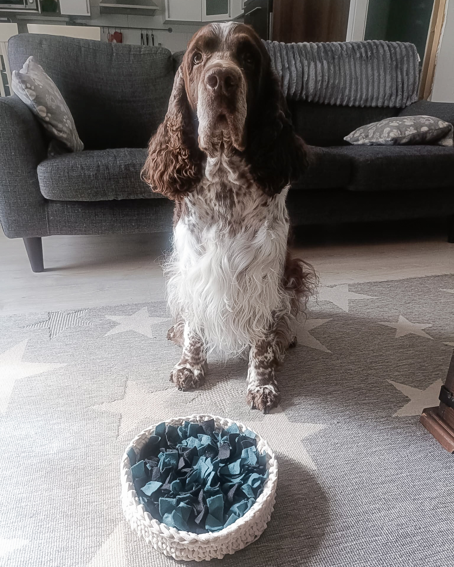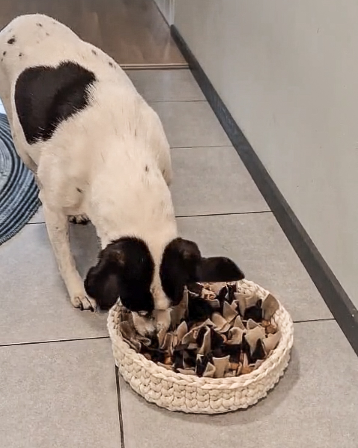 Nuuskukori on oikeesti tosi kiva, koska se on tarpeeksi helppo eikä vanha Uuno turhaudu 😍 Hienosti Hemmo jaksoi nuuskutella ja kori oli tarpeeksi motivoiva, ei liian vaikea 😊 Mietin et limottuuko nuo huopakangaslärpäkkeet, mut ei! 😊 Tosi hyvä ja otetaan tästä kyllä iltapuuhaa useamminkin 😍 Lisäksi kivaa oli se, että maton päällä kori pysyi kivasti paikallaan!