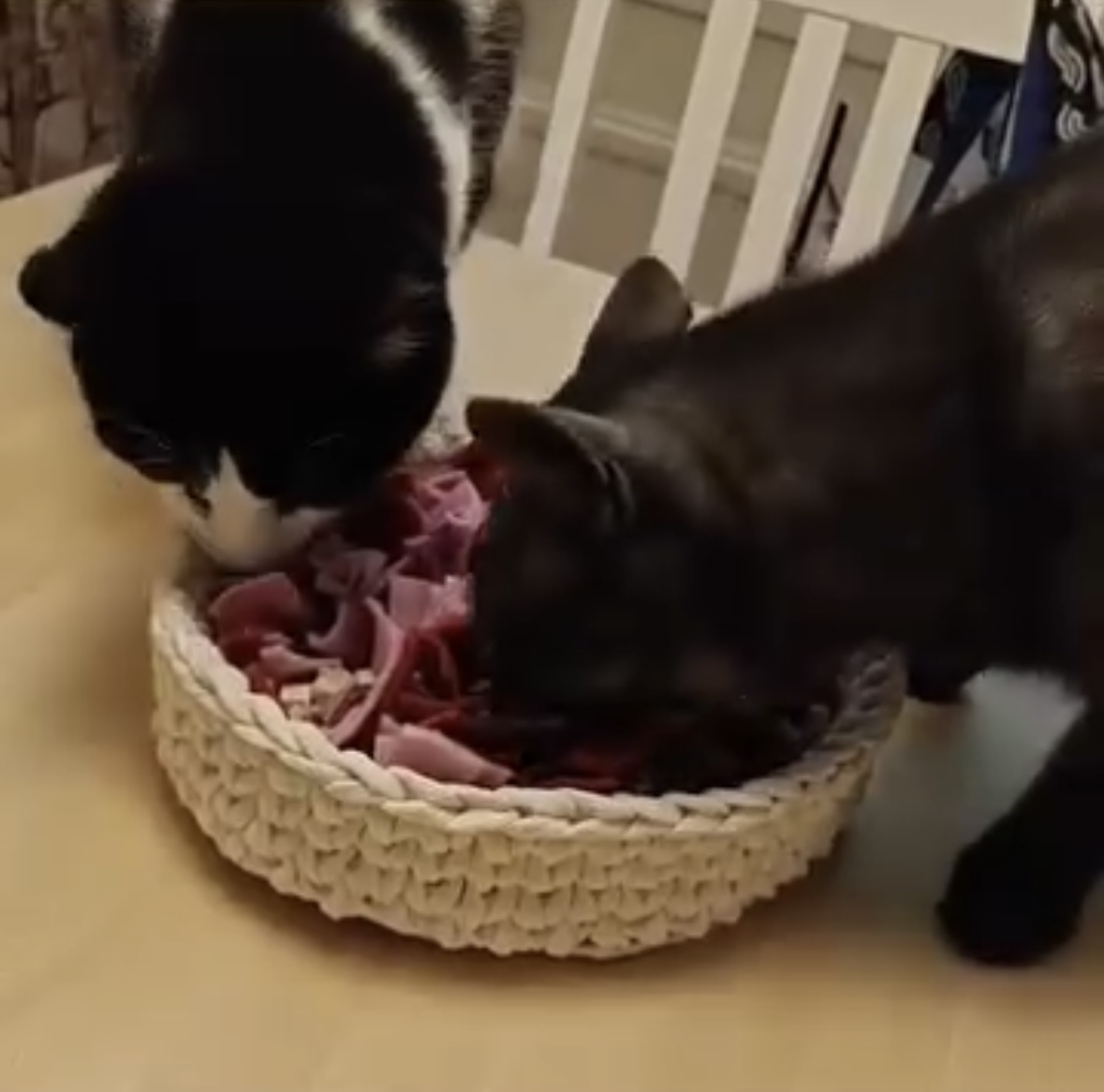 Hyvin ruoka maistuu nuuskukorista. Ja jos herkkuja on korissa vain muutamia, niitä saa ihan etsiä, eli ei ole liian helppoa puuhaa. Yleensä ahmimalla syövä söi melko rauhallisesti. Jos koko ruoka-annoksen laittaa koriin, voisi kori olla hiukan isompi.