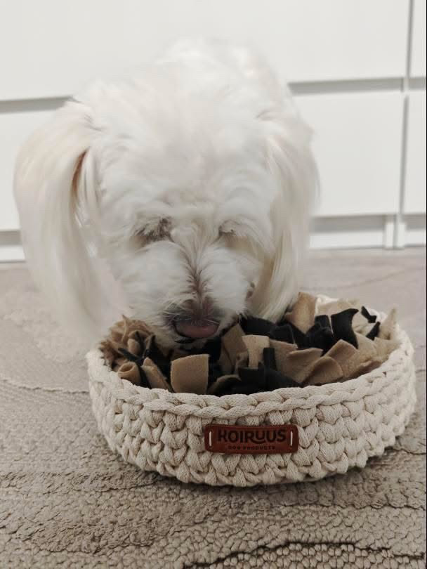 Nuuhku on käsityönä valmistettu nuuskukori, joka tarjoaa koirallesi hauskaa ja rauhoittavaa tekemistä arkeen. Piilota nappuloita tai nameja korin pehmeiden kangassuikaleiden sekaan, ja anna koirasi toteuttaa luontaista hajuaistiaan ja etsintäkäyttäytymistään.