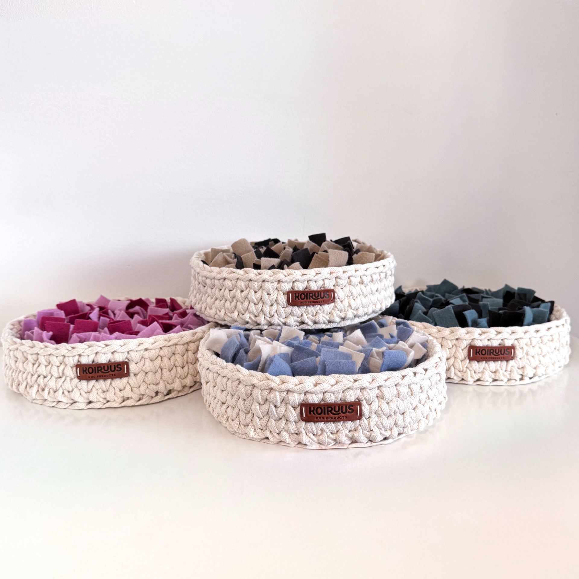 Nuuhku on käsityönä valmistettu nuuskukori, joka tarjoaa koirallesi hauskaa ja rauhoittavaa tekemistä arkeen. Piilota nappuloita tai nameja korin pehmeiden kangassuikaleiden sekaan, ja anna koirasi toteuttaa luontaista hajuaistiaan ja etsintäkäyttäytymistään.