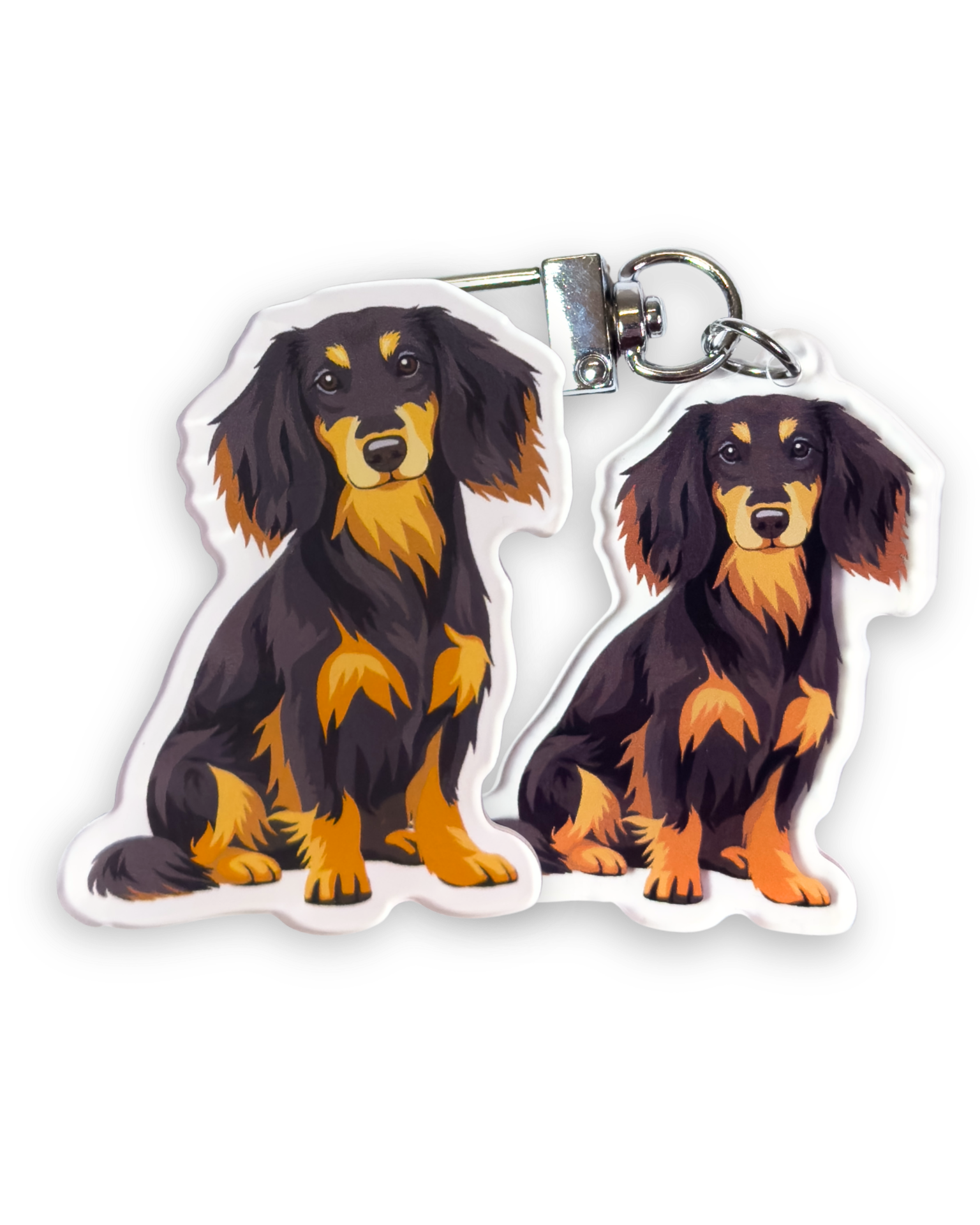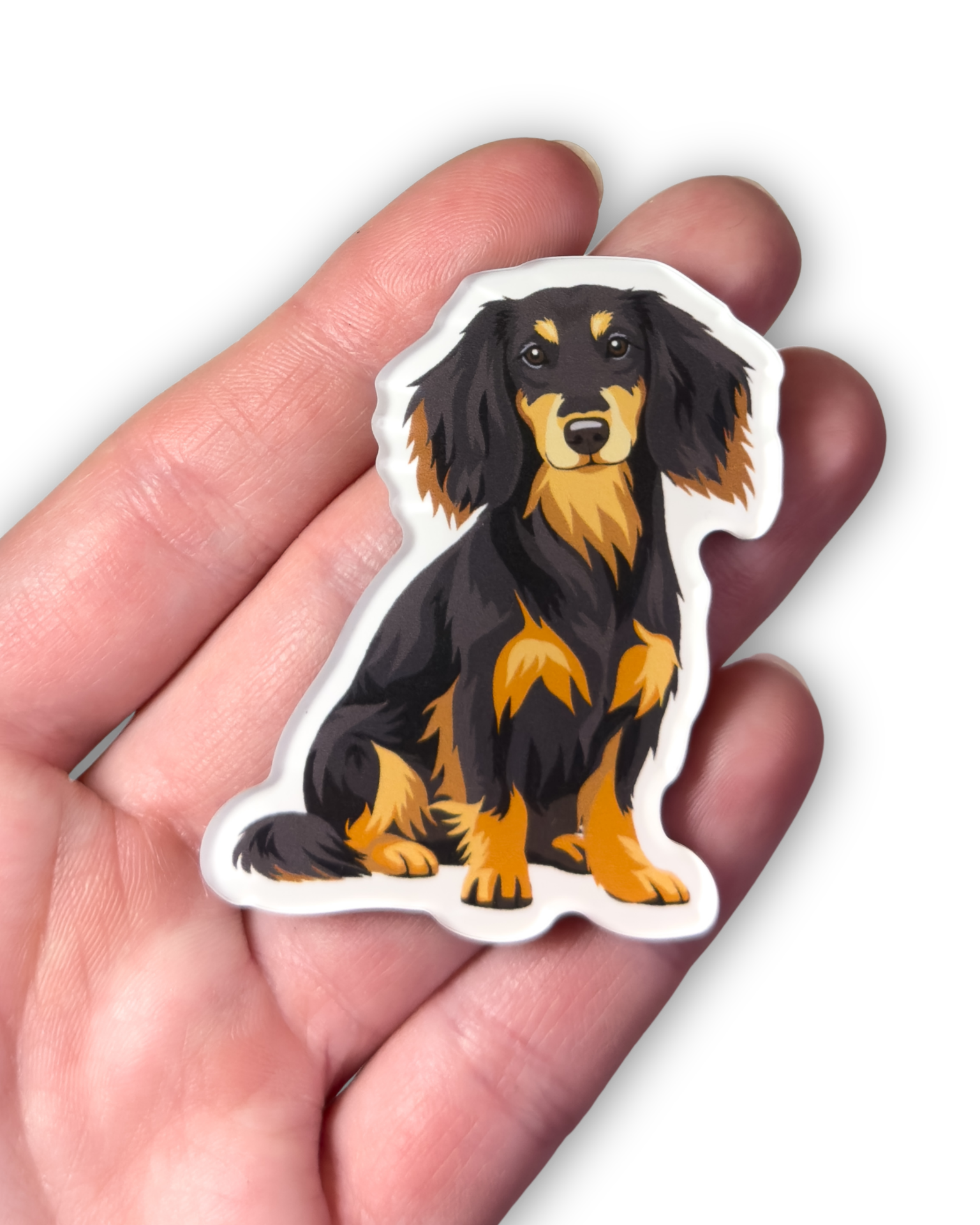 Pitkäkarvainen mäyräkoira -magneetti (musta ruskein merkein)